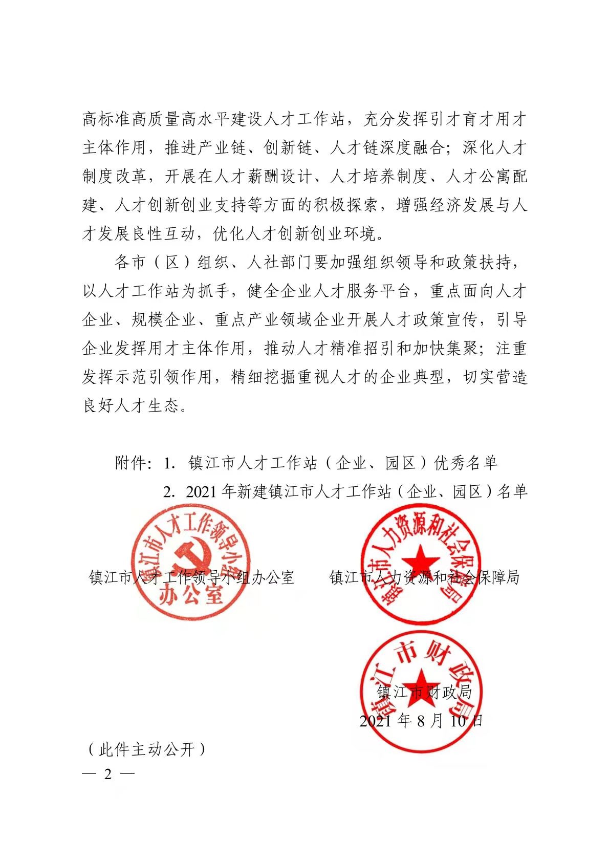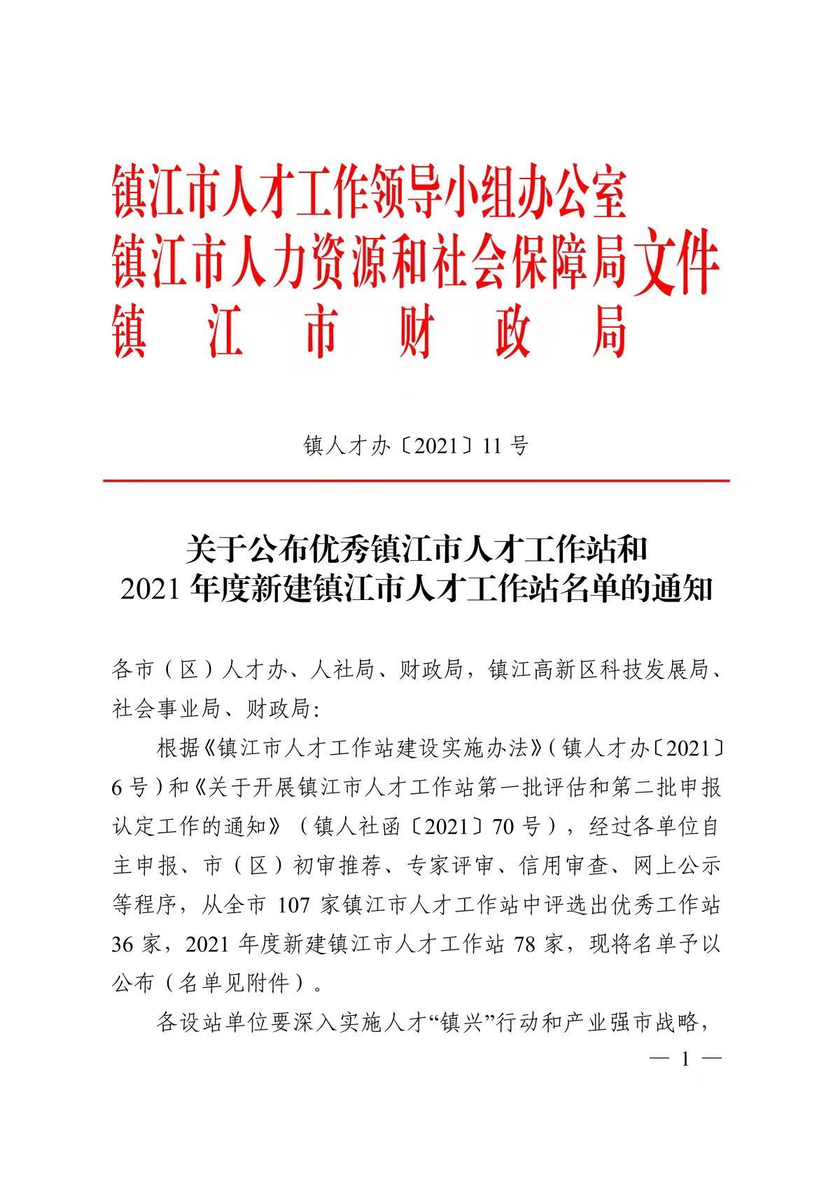 8月10日,鎮江市人才工作領導小組辦公室 、鎮江市人力資源和社會保障局、鎮江市財政局聯合發文(鎮人才辦〔2021〕11 號)公布優秀鎮江市人才工作站名單。江蘇恒神股份有限公司在評選中脫穎而出,榮獲“2020年度優秀鎮江市人才工作站”稱號。